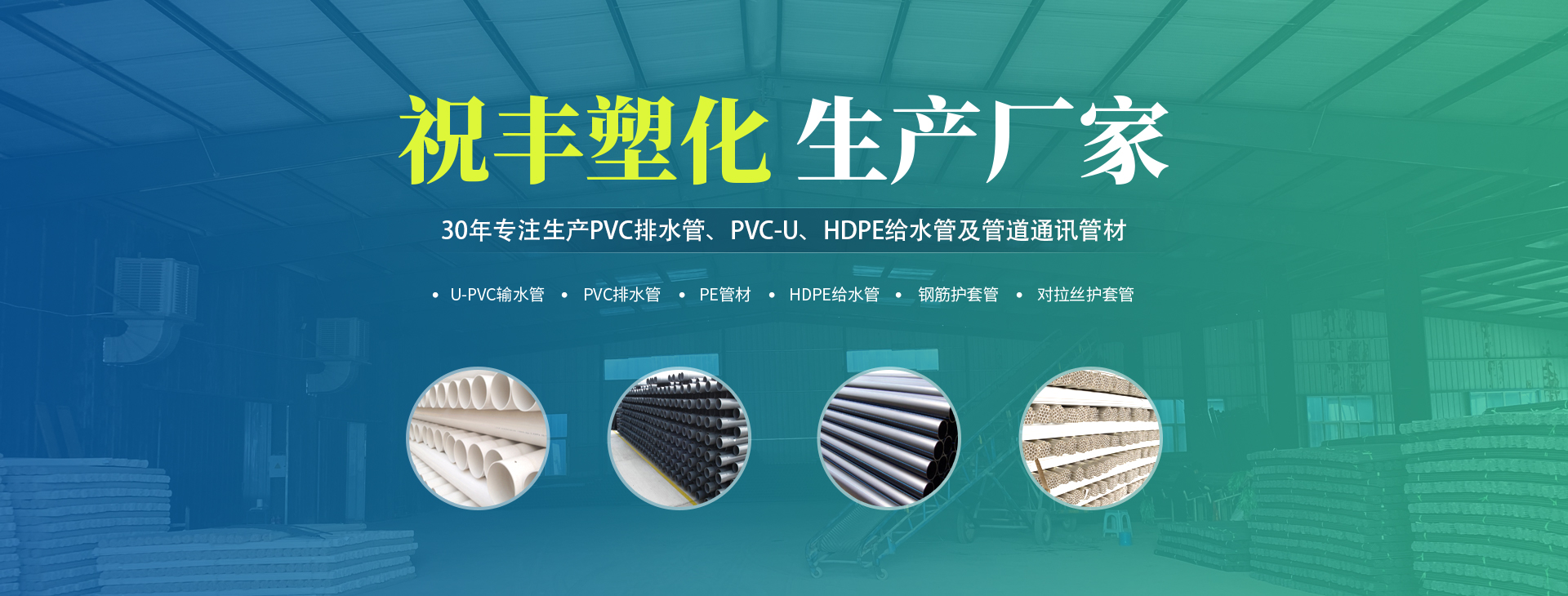 安阳市祝丰塑化有限公司坐落在滑县工业园区,东临大广高速,西临京珠高速,是郑州、鹤壁、安阳、濮阳四个城市的输纽,交通便利、环境优美。 公司始建于八十年代,经过二十余年的艰辛创业,规模不断壮大,由十多万元资产的小厂,发展到现占地面积达一万多平,建筑面积一万平,资产2000多万元管材生产企业。公司生产PVC-U、PVC排水管、HDPE给水管、钢筋护套管管道通讯管材等产品,广泛用于农田节水、高山引水、人畜用水、建筑、电力通讯等多种用途,品种齐全。为了满足用户需求,可承揽各种给水、节水、灌溉工程。“祝丰塑化”凭借强劲的实力,优良的管理水平。“以质量求生存,以信誉求发展”的原则全力以赴和大家共同塑造美好未来。..